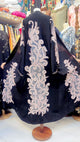 This elegant long dress in a soft beige shade features exquisite floral embroidery on sheer fabric panels placed on the front lower section. The embroidery showcases delicate pink and white flowers with intricate silver detailing, creating a refined and graceful look. Designed with a V-neckline and long flowy sleeves, the dress offers a modest yet stylish silhouette. The scalloped edges of the sheer panels add a sophisticated finish. It is ideal for special occasions or festive gatherings, providing both comfort and elegance.